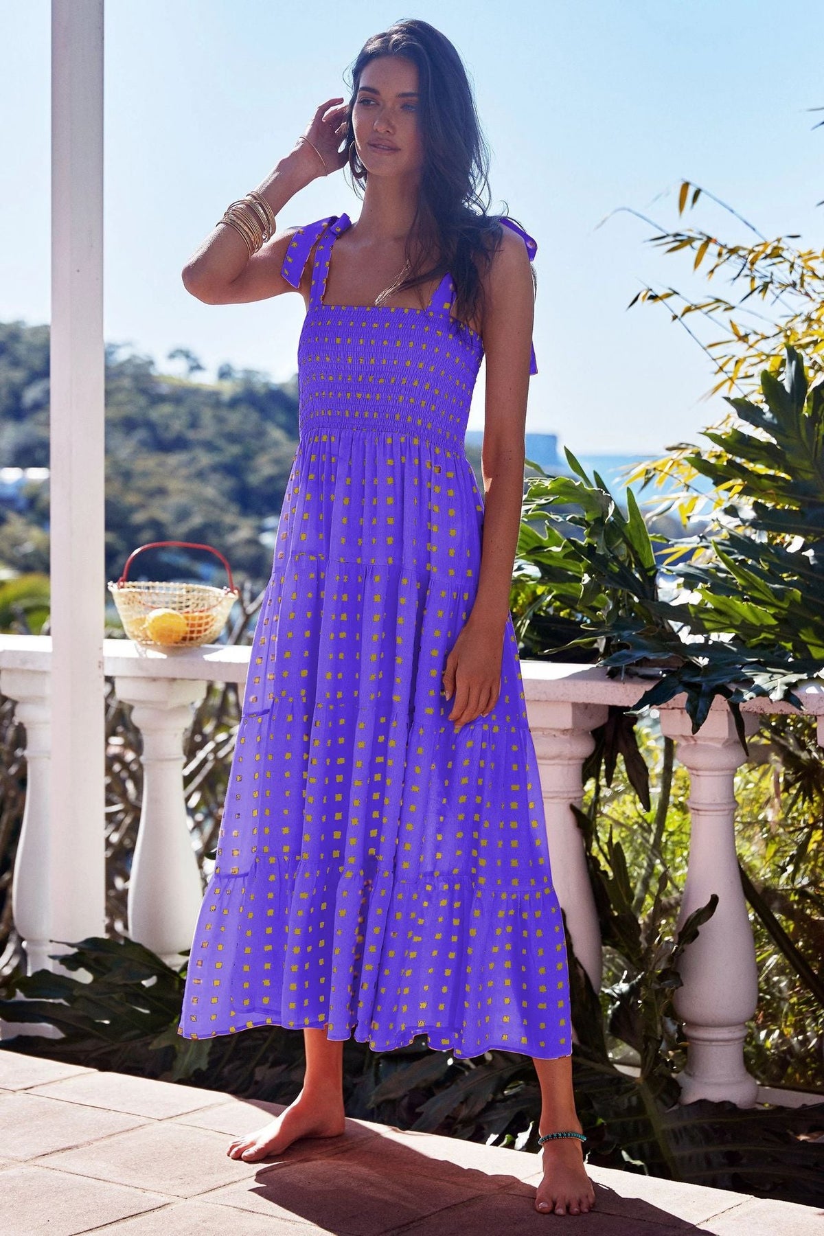 Ontdek de perfecte combinatie van comfort en stijl met deze luchtige midi jurk. De smockbovenzijde en brede schouderbanden zorgen voor een flatterende pasvorm, terwijl de ademende stof soepel valt en je figuur mooi accentueert zonder in te boeten op bewegingsvrijheid. Het speelse A-lijn silhouet en de zwierige rokdelen maken de jurk ideaal voor zonnige dagen, vakanties of een relaxte lunch aan zee.